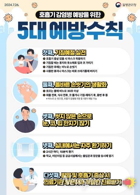감염병 예방을 위한 주요 수칙으로는 ▲흐르는 물에 비누로 30초 이상 손 씻기 ▲기침‧재채기 시 옷소매로 입과 코 가리기 ▲발열‧기침 등 호흡기 증상 시 등교 및 등원 자제 ▲실내 자주 환기하기 ▲호흡기 증상 시 마스크 착용 후 의료기관 방문 ▲수두, MMR 등 연령별 예방접종 실시 등이 있다.
