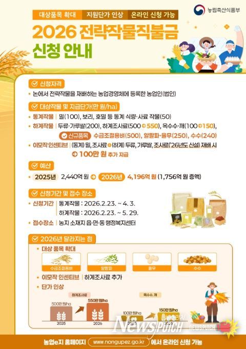 올해부터 전략작물직불제 하계 조사료 지원단가는 ha당 500만 원에서 550만 원으로 인상된다. 동계 밀·조사료와 하계 두류·가루쌀·조사료를 재배하는 이모작의 경우 ha당 100만 원이 추가 지원돼 논을 활용한 조사료 재배 확대가 기대된다.