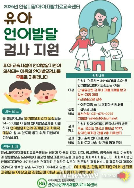 뉴스펀치 박상훈 기자 | 안성시장애아재활치료교육센터가 지역 내 언어발달 지연이 의심되는 유아를 대상으로 조기 발견과 적기 치료를 돕기 위한 ‘무료 언어발달검사’를 지원한다.