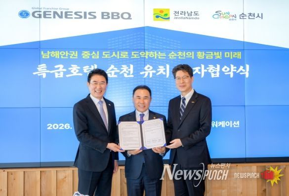 뉴스펀치 최영남 기자 | 순천시는 13일 전라남도, 제너시스BBQ와 함께 정원워케이션센터에서 ‘특급호텔 건립 등을 위한 투자협약(MOU)’을 체결했다고 밝혔다.