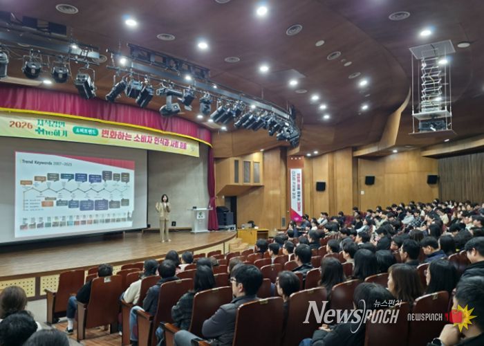 권정윤 강사는 2026년 대한민국 소비 흐름의 주요 특징을 설명하며 ‘트렌트코리아’에서 제시한 핵심 키워드를 중심으로 사회 변화 흐름을 소개했다. 이어 소비 성향과 생활 방식의 변화가 사회와 산업 전반에 미치는 영향을 다양한 사례를 통해 설명했다.