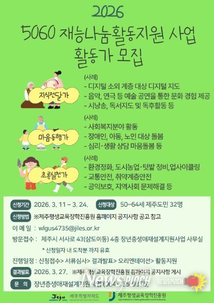 뉴스펀치 김용희 기자 | (재)제주평생교육장학진흥원(원장 진희종)에서는 제주도민 50~64세 대상으로 ‘5060재능나눔 활동가’를 모집한다.