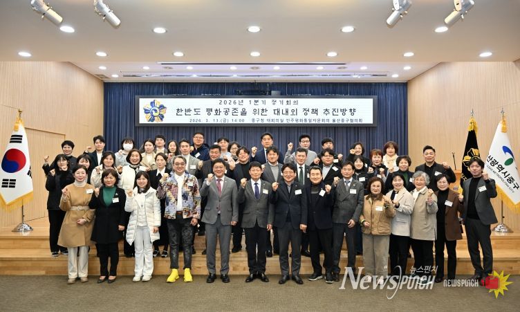 뉴스펀치 김윤걸 기자 | 민주평화통일자문회의 울산중구협의회(회장 이오규)가 3월 13일 오후 2시 중구청 대회의실에서 ‘한반도 평화공존을 위한 대내외 정책 추진 방향’이라는 주제로 2026년 1분기 정기회의를 개최했다.
