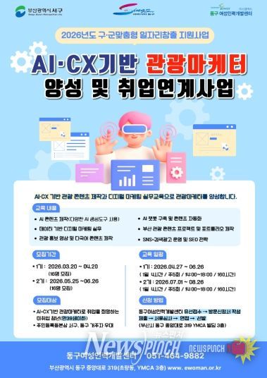 뉴스펀치 김윤걸 기자 | 부산 서구와 동구가 연합하여 부산시 공모사업인 '2026년 구·군 맞춤형 일자리 창출 지원사업'에 선정돼 지역 관광산업 경쟁력 강화와 청년 일자리 창출을 위한 ‘AI·CX 기반 관광마케터 양성 및 취업연계 사업’을 추진한다.