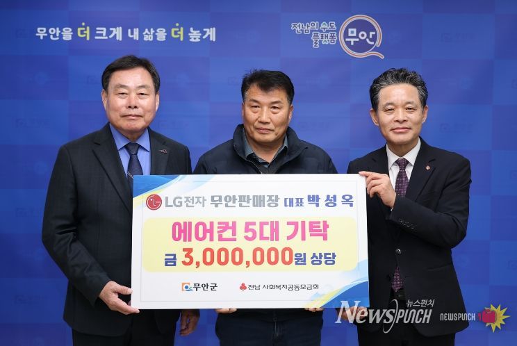 뉴스펀치 김용희 기자 | 무안군은 지난 13일 LG전자 무안판매장 박성옥 대표가 관내 취약계층의 여름철 생활환경 개선을 위해 에어컨 5대를 기탁했다고 밝혔다.