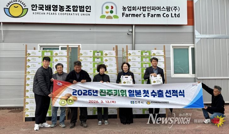 뉴스펀치 박세훈 기자 | 진주시는 지난 12일 문산읍 한국배영농조합법인에서 수출 관계자 8여 명이 참석한 가운데 키위 일본 수출을 위한 선적식을 개최했다고 밝혔다.