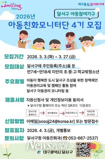 뉴스펀치 조평훈 기자 | 대구 달서구는 아동 정책에 대한 의견을 제시하고 아동권리 증진 활동에 참여할‘아동친화모니터단 4기’단원을 오는 27일까지 모집한다.