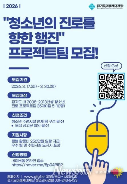 뉴스펀치 박상훈 기자 | 경기도미래세대재단은 17일부터 30일까지 ‘청소년의 진로를 향한 행진’ 사업에 참여할 청소년 프로젝트팀을 모집한다.