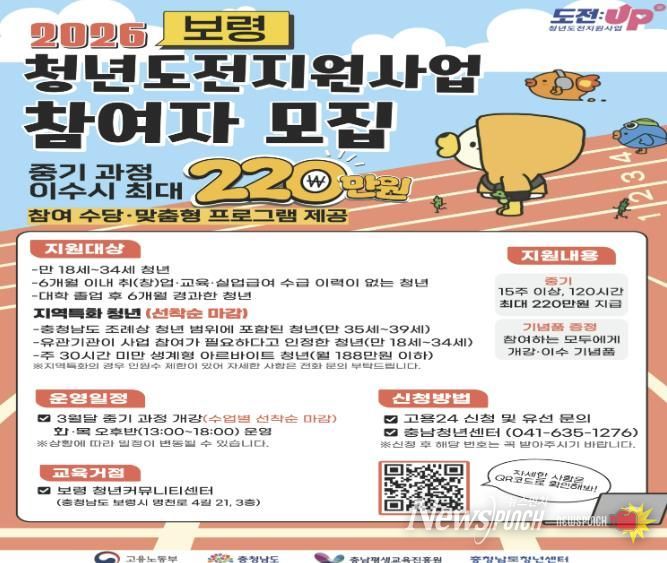 뉴스펀치 이현승 기자 | 보령시는 충남청년센터와 협력해 구직에 어려움을 겪는 지역 청년들을 대상으로 ‘청년도전 지원사업’ 참여자를 모집한다고 밝혔다.