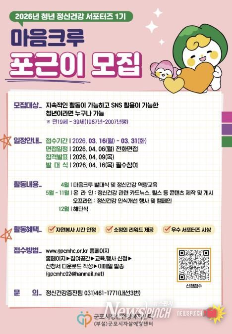 뉴스펀치 박상훈 기자 | 군포시정신건강복지센터는 지역사회 정신건강 인식 개선과 생명존중 문화 확산을 위해 청년 정신건강 서포터즈 1기 ‘포근이’를 3월 16일부터 3월 31일까지 모집한다.
