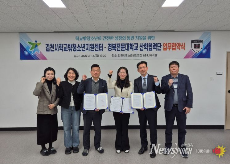 뉴스펀치 박세훈 기자 | 김천시학교밖청소년지원센터는 13일 경북전문대학교 산학협력단과 ‘학교 밖 청소년의 건강한 성장과 자립 지원’을 위한 업무협약(MOU)을 체결했다.