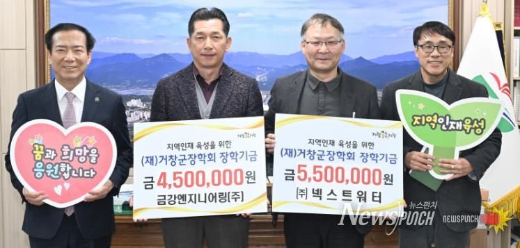 거창하수처리장 관리대행 업체인 ㈜넥스트워터(대표 김인석)와 금강엔지니어링㈜(대표 정선용)은 각각 550만 원과 450만 원을 거창군장학회에 기탁하며, 운영 수입의 일부를 지역사회에 환원하고 지역인재 양성에 보탬이 되는 뜻깊은 나눔을 실천했다.