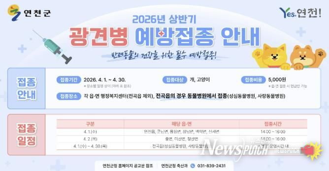 뉴스펀치 박상훈 기자 | 연천군은 오는 4월 1일부터 4월 30일까지 ‘2026년 상반기 광견병 예방접종’을 일제히 실시한다고 밝혔다. 실시 대상은 연천군 관내 가정에서 사육하는 개, 고양이 등 광견병 전염 우려가 있는 동물이다.