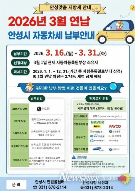 뉴스펀치 박상훈 기자 | 안성시가 지난 1월 자동차세 연납 혜택을 놓친 시민들을 위해 오는 3월 31일까지 ‘자동차세 3월 연납’ 신청을 받는다고 밝혔다.