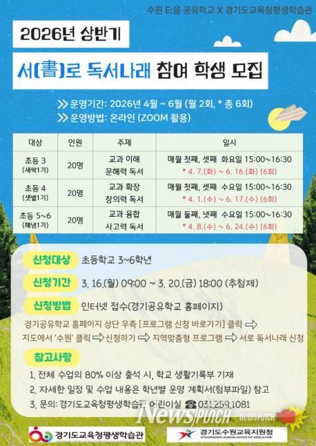 뉴스펀치 박상훈 기자 | 경기도교육청평생학습관이 수원교육지원청과 함께 초등학생의 문해력과 사고력 향상을 위한 경기공유학교 ‘서(書)로 독서나래’를 운영한다.