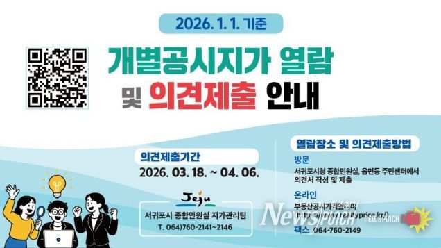 뉴스펀치 김용희 기자 | 서귀포시는 2026년 1월 1일 기준 개별공시지가 산정을 완료하고, 3월 18일부터 4월 6일까지 개별공시지가 열람 및 의견 제출 기간을 운영한다고 밝혔다.