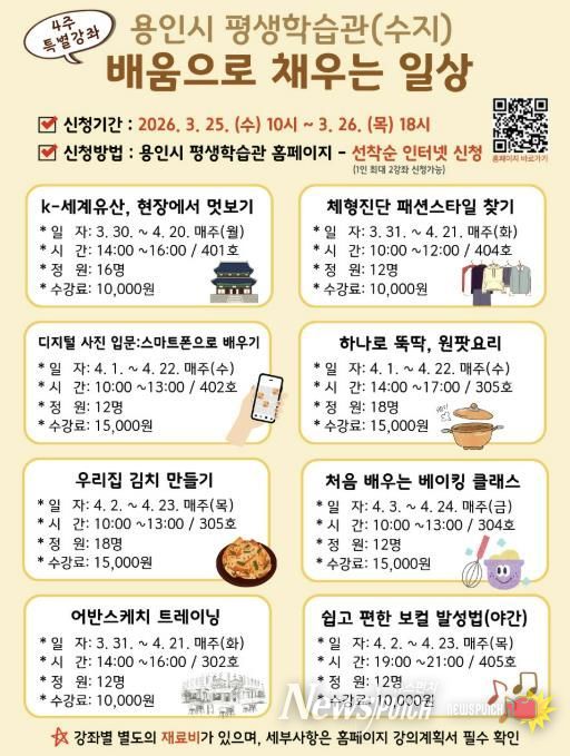 접수는 용인시 평생학습관 누리집을 통해 선착순으로 진행된다.
