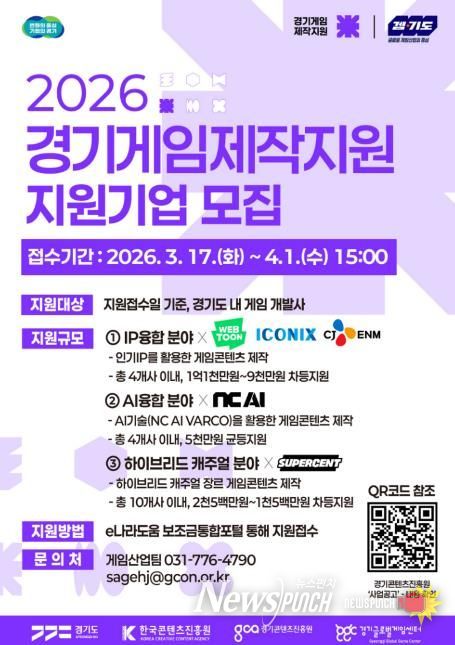 뉴스펀치 박상훈 기자 | 경기도와 경기콘텐츠진흥원이 도내 게임 기업의 경쟁력 강화와 글로벌 시장 진출을 위해 ‘2026년 경기게임제작지원’과 ‘2026년 게임 상용화 지원’ 사업 참여기업을 오는 4월 1일까지 모집한다.