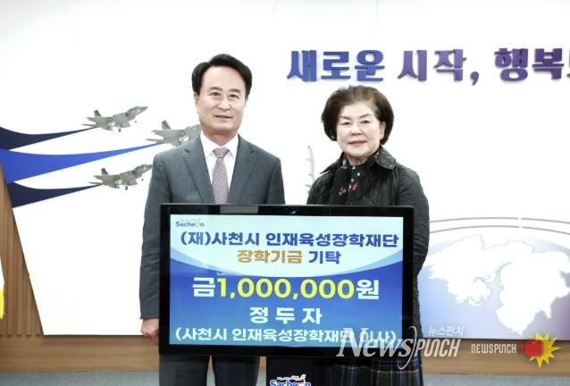 뉴스펀치 박세훈 기자 | 사천시 인재육성장학재단은 정두자 이사가 지난 16일 사천시청 시장실을 방문해 지역 사회의 미래를 이끌어갈 우수 인재 양성에 힘을 보태고 싶다며 장학기금 100만 원을 기탁했다고 17일 밝혔다.