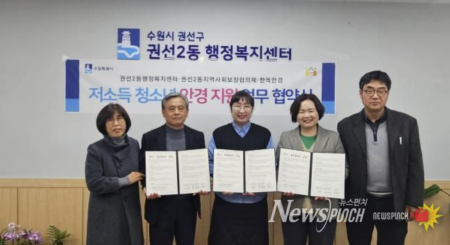 뉴스펀치 박상훈 기자 | 수원시 권선구 권선2동은 지난 13일 권선2동 지역사회보장협의체, 한독안경과 ‘저소득 청소년 안경 지원사업’ 업무협약을 체결했다고 밝혔다.