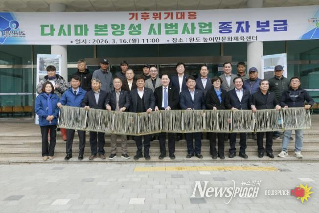 지난 3월 16일, 농어민문화체육센터에서 어업인과 관계 기관 등이 참석한 가운데 ‘다시마 종자 본양성 시범 사업’에 대한 행사를 갖고, 금일읍과 노화읍, 청산면, 보길면, 생일면 등 6개 어촌계에 1,000여 개의 채묘(종자) 틀을 공급했다.