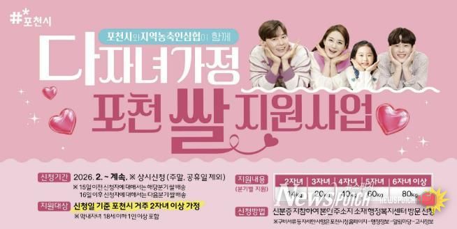 이번 사업은 다자녀 가구의 생활비 부담을 완화하는 동시에 지역 농업과의 상생을 도모하기 위해 추진하는 포천시의 대표적인 인구정책이다. 포천시는 지난 1월 26일 시청에서 엔에이치(NH)농협 포천시지부와 관내 9개 지역 농·축·인삼협과 업무협약을 체결하고 다자녀 가구 지원 확대를 위한 협력체계를 구축했다.