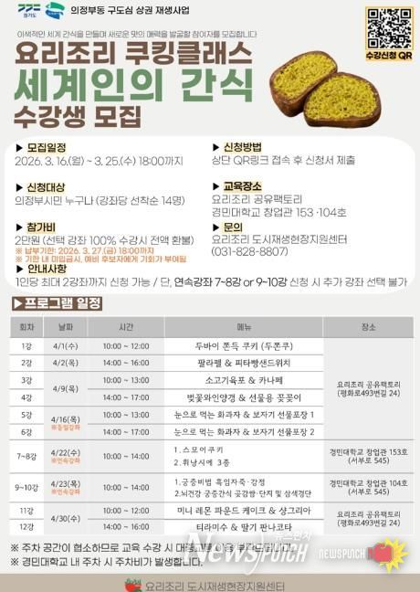 뉴스펀치 박상훈 기자 | 의정부시는 의정부 전통시장의 신선한 식재료를 활용해 이색적인 간식을 만들어 보는 요리조리 쿠킹클래스 ‘세계인의 간식’ 참여자를 모집한다.