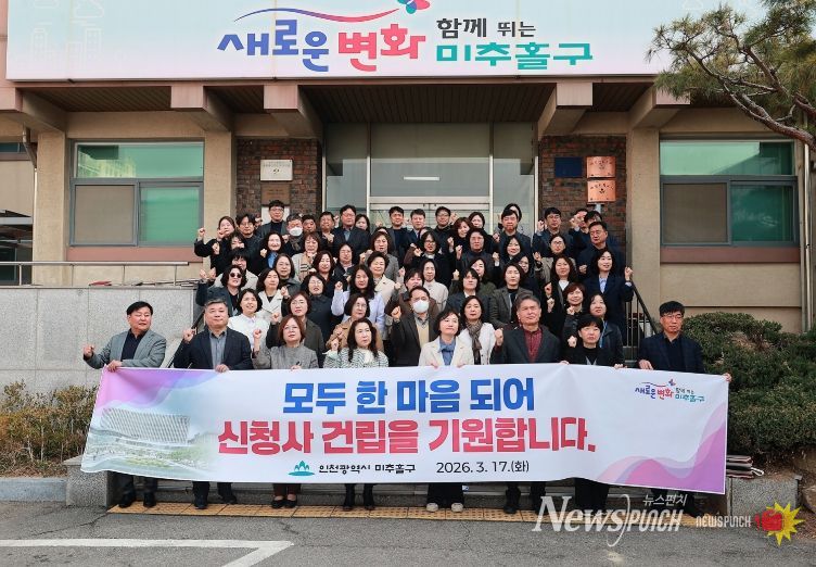 뉴스펀치 정홍균 기자 | 인천 미추홀구는 17일 간부 공무원 70여 명이 모인 가운데 ‘미추홀구 신청사 건립의 신속한 추진’을 촉구하는 성명서를 발표했다.