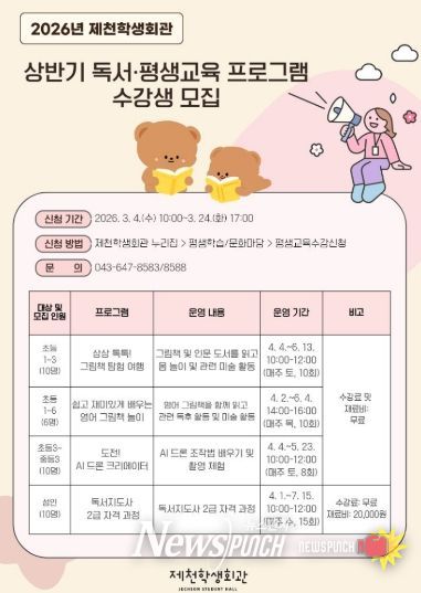 제천학생회관 홈페이지를 통해 프로그램 수강 신청이 가능하며, 접수는 3월 24일까지 진행된다.