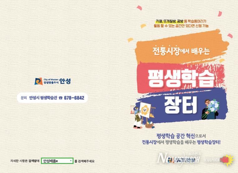 뉴스펀치 박상훈 기자 | 안성시는 오는 3월 23일부터 전통시장 내 유휴공간을 평생학습 공간으로 조성하는 ‘평생학습장터’ 학습공간과 지정 된 공간에서 평생교육 프로그램을 운영할 학습동아리를 모집한다.