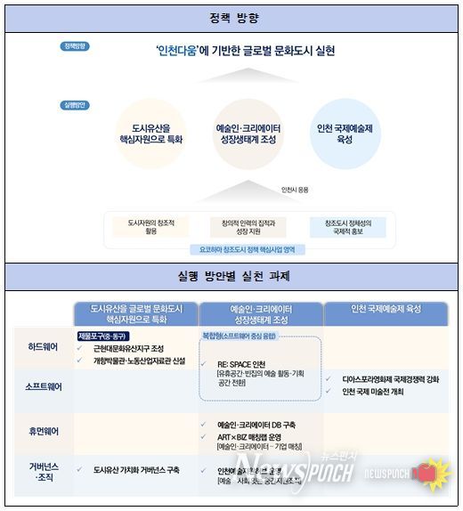 그리고 이러한 방향성 속에서 근현대 문화유산지구 조성, 인천개항도시박물관 및 인천노동산업자료관 신설, 도시유산 가치화 거버넌스 구축, 유휴공간의 예술적 전환, 예술인・크리에이터 DB 구축, 예술과 비즈니스를 연계한 ART×BIZ 매칭랩 운영, 인천예술지원허브 운영, 디아스포라영화제 국제 경쟁력 강화, 인천 국제 미술전 개최 등의 실천 과제를 제안했다.