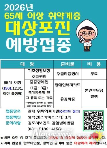 김포시보건소 관계자는 “대상포진 예방접종 지원사업을 통해 취약계층 어르신들의 건강 보호와 의료비 절감에 실질적인 도움이 되길 바란다”고 밝혔다.