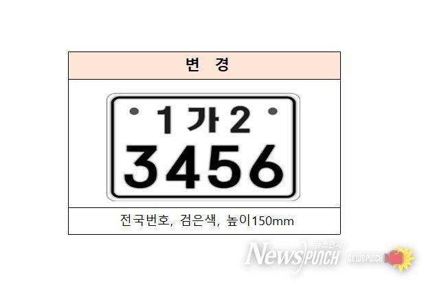 새롭게 도입되는 이륜자동차 번호판은 기존보다 크기가 확대되고 디자인이 변경된다. 번호판 규격은 기존 210mm☓115mm에서 210mm☓150mm로 확대되며, 글자 색상도 파란색에서 검은색으로 변경된다. 또한, 반사 성능이 강화된 재질이 적용돼 주·야간 식별성이 개선될 예정이다.