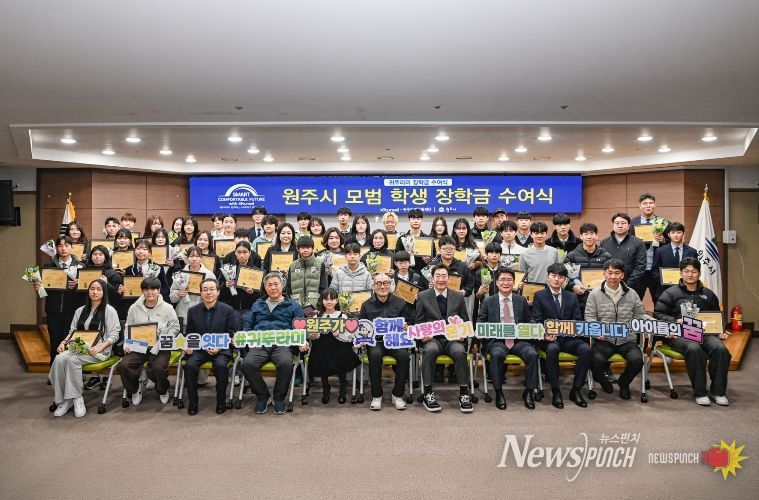 뉴스펀치 조평훈 기자 | 원주시는 17일 오전 10시, 시청 지하 1층 다목적홀에서 귀뚜라미문화재단 장학금 및 장학증서 수여식을 개최하고, 예체능 분야에서 재능과 성장 가능성을 보인 지역 중·고등학생 50명에게 장학금을 전달했다.