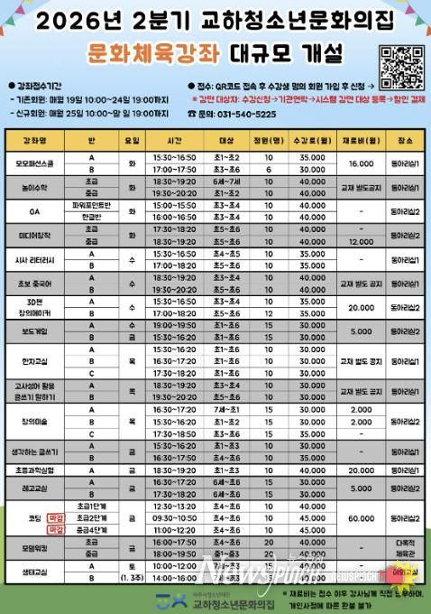 뉴스펀치 박상훈 기자 | (재)파주시청소년재단 교하청소년문화의집은 2026년을 맞아 지역 청소년들의 다채로운 꿈과 잠재력을 폭넓게 지원하기 위해 문화체육강좌를 대규모로 증설하고 새롭게 단장했다.