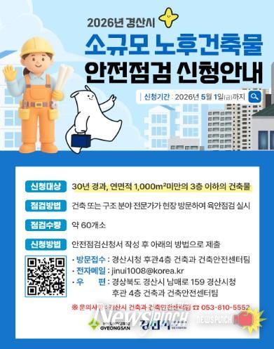 뉴스펀치 박세훈 기자 | 경산시는 법적으로 안전 점검 의무가 없는 소규모 노후 건축물을 대상으로 건축 전문가가 참여한 안전 점검을 추진, 이달 16일부터 5월 1일까지 신청자를 모집한다.