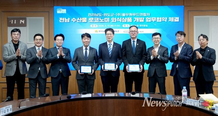 뉴스펀치 김용희 기자 | 전라남도는 17일 도청 정약용실에서 완도군, ㈜풀무원푸드앤컬처와 휴게소 특화메뉴 개발을 위한 업무협약(MOU)을 했다.