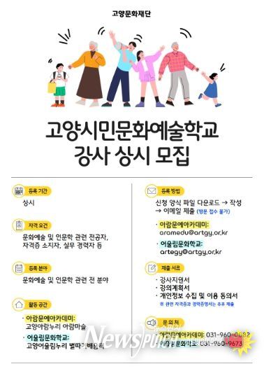 뉴스펀치 박상훈 기자 | 고양문화재단은 시민들에게 참신하고 수준 높은 문화예술교육 서비스를 제공하기 위해 ‘고양시민문화예술학교’(아람문예아카데미 및 어울림문화학교) 강사 인력풀(POOL)을 상시 모집한다.
