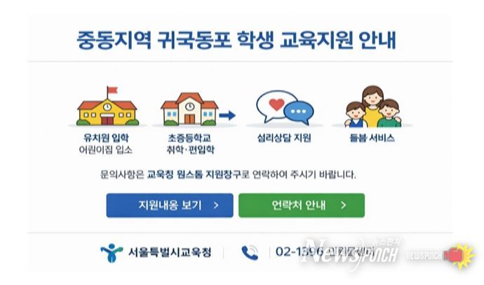 뉴스펀치 박상훈 기자 | 서울특별시교육청은 중동전쟁으로 인해 현지에서 긴급 귀국한 학생들이 안정적으로 학교생활에 복귀할 수 있도록 '중동전쟁 관련 귀국 학생 지원 원스톱 대응 체계 운영계획'을 수립하고 긴급 대응 지원에 나선다고 밝혔다.