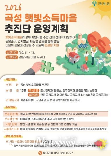 곡성군 관계자는 “햇빛소득마을 추진단을 중심으로 행정과 유관기관이 협력해 마을별 맞춤형 지원체계를 구축해 나가겠다”라며 “사전 컨설팅을 통해 사업 추진 가능성을 꼼꼼히 검토하고 더 많은 마을이 공모사업에 참여할 수 있도록 적극 지원하겠다”라고 말했다.