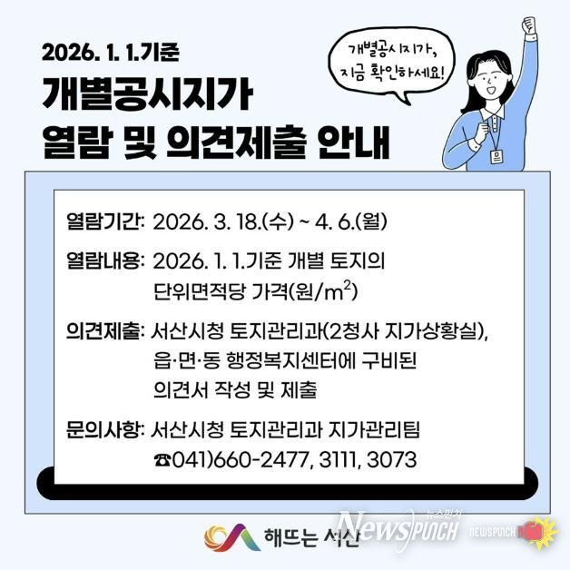 뉴스펀치 이현승 기자 | 충남 서산시는 2026년 1월 1일 기준으로 산정한 33만 8,821필지의 개별공시지가에 대해 의견을 접수한다고 밝혔다.