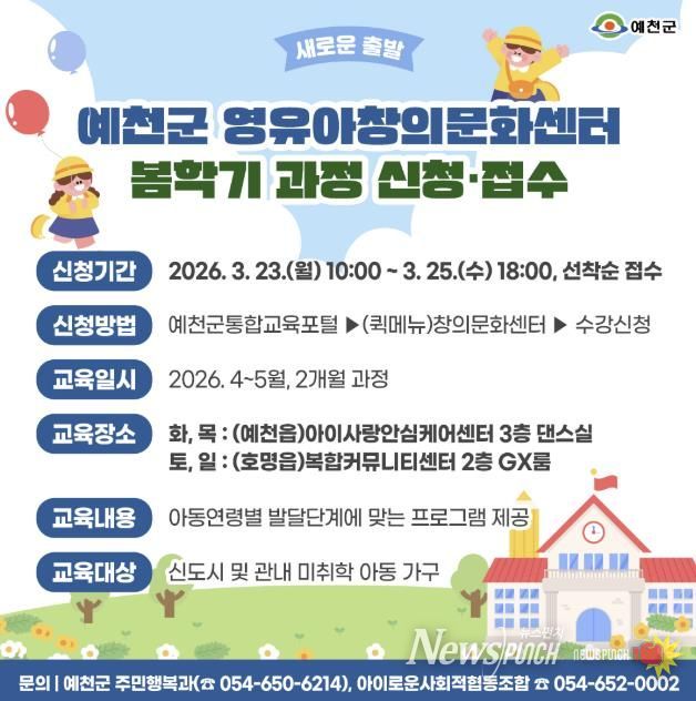 뉴스펀치 박세훈 기자 | 예천군은 관내 영유아의 건강한 성장과 창의력 발달을 지원하기 위해 예천군 영유아 창의문화센터 봄학기 프로그램 수강생을 모집한다.