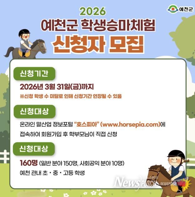 뉴스펀치 박세훈 기자 | 예천군은 2026년도 학생 승마체험 지원사업을 오는 31일까지 접수한다고 밝혔다.