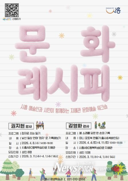 뉴스펀치 박상훈 기자 | 시흥시가 지역 예술인과 시민이 함께 참여하는 문화예술 프로그램 ‘2026 문화레시피’를 4월부터 11월까지 시흥ABC행복학습타운 지혜관에서 운영한다.