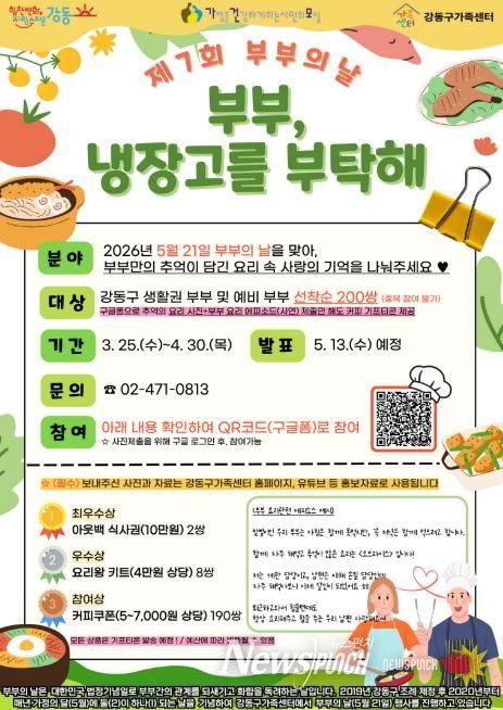 이번 공모는 3월 25일부터 4월 30일까지 온라인으로 진행되며, 강동구에 거주하거나 생활하는 부부 또는 예비부부라면 누구나 참여할 수 있다. 참여를 원하는 경우 QR코드를 통해 요리 사진과 사연을 제출하면 되며, 선착순 200쌍에게는 커피 기프티콘이 제공된다.