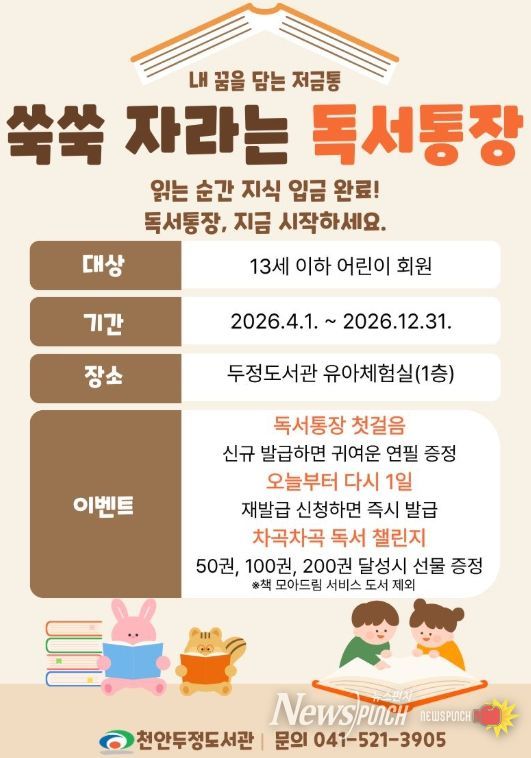 뉴스펀치 이현승 기자 | 천안시 두정도서관은 내달부터 어린이들의 독서습관 형성을 위한‘쑥쑥 자라는 독서통장’프로그램을 운영한다고 18일 밝혔다.