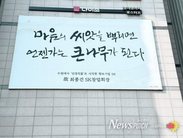 뉴스펀치 박상훈 기자 | 수원특례시는 SK 창업주 고 최종건 회장과 고 최종현 선대회장의 어록을 담은 ‘2026 수원희망글판’ 문안을 에이케이(AK)플라자 수원점 외벽과 아이비케이(IBK)기업은행 동수원지점 외벽에 게시했다.