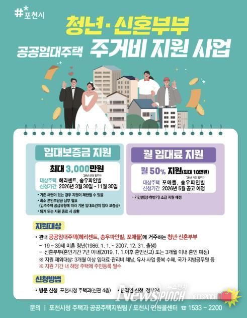 뉴스펀치 박상훈 기자 | 포천시는 관내 공공임대주택에 거주하는 청년 및 신혼부부를 대상으로 ‘2026년 청년·신혼부부 공공임대주택 주거비 지원사업’을 시행한다.