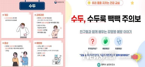 최근 3년간의 평택시 감염병 발생 데이터를 분석해 시기별 유행 가능성이 높은 감염병을 매월 선정하고 특히, 새 학기가 시작되는 3월에는 단체생활로 인해 감염 위험이 높은 ‘수두’를 이달의 감염병으로 선정, 유치원, 초등학교 등에 맞춤형 교육·홍보자료를 제공했다.