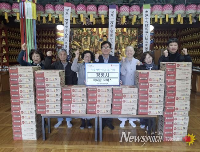 뉴스펀치 박상훈 기자 | 가평 청룡사는 최근 지역의 소외된 이웃들에게 도움이 되길 바라는 마음으로 청평면 행정복지센터에 즉석밥 60박스를 기탁했다.
